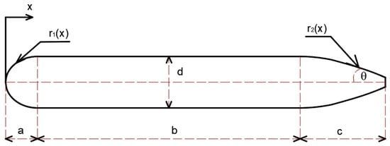 The profiles of the nose and tail of a torpedo-shaped underwater glider are shown in Figure 1. The torpedo shape is initially selected to be a cylindrical body with the length of the nose a, the length of hull b, the length of tail section c, the maximum diameter of the glider d, and the angle at the tip 2θ. For modeling the profiles of the nose and tail of the torpedo, Myring’s equations were used to minimize the drag force acting on the torpedo body [7]. The given shape of the glider’s nose and tail is described as:
