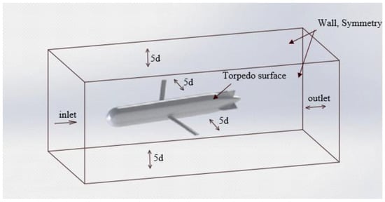 The fluid domain related to the boundary conditions is shown in Figure 2. The prescription of the boundary conditions for the fluid around a torpedo body is shown in Table 2. The parameters of the fluid (seawater) selected in the simulations are salinity S = 35 g/kg, temperature T = 15 °C, density ρ = 1027 kg/m3, and fluid viscosity μ = 1.25 mPa.s [40,41,42].