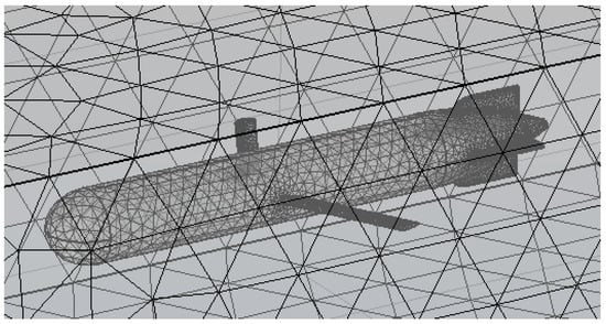 The hydrodynamic characteristics of a torpedo-shaped underwater glider are numerically investigated by CFD simulations in the present study. For a challenging problem, the physical variables change significantly around the torpedo surface. A dense mesh must be located around the torpedo surface during the actuation process to guarantee the exact solution (Figure 3). It is very necessary to track the fine mesh moving simultaneously with the torpedo body. Therefore, the arbitrary Lagrangian–Eulerian (ALE) method is used to handle this problem. On the other hand, the 3-D governing equations with the relevant boundary conditions are solved by using the finite element method (FEM) with second-order Lagrange triangular elements. The dependency of the number of elements on the numerical results is determined to guarantee the exact solution. The poor quality of mesh elements can lead to collapse and inversion of the mesh, and elements could be wrapped inside-out or have zero volume. In this torpedo model, the mesh structure generated by a 3-D tetrahedral meshing technique is proposed. The finer mesh at the fluid-solid interface of the glider is carried out to ensure the accuracy of the numerical results [43].