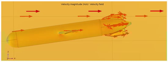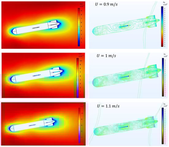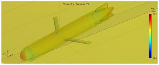 The computational domain around the gilder is the water with the density (at 20 °C) = 1027 kg/m3 and the dynamic viscosity μ = 1.25 MPa.s. The maximum operational depth is 100 m, where the absolute pressure is about 105 Pa. The hull’s profile was improved several times. The numerical results are based on the circumstance that the glider moves in a forward direction with the velocity U = 1 m/s and angle of attack θ = −10°. The velocity fields, streamlines, and pressure distribution are presented in Figure 4. The wake region is located at the tail part of the underwater glider. In this simulation, the speed of fluid flow is set at 1 m/s, and the angle of attack is −10°. It reduced the strength of the wake that could be seen in Figure 4 based on the direction of arrows.