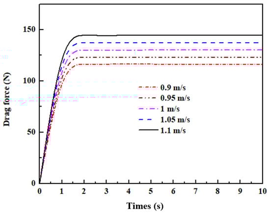 Drag forces acting on the glider body with the angle of attack θ = −10° at the different velocities.
