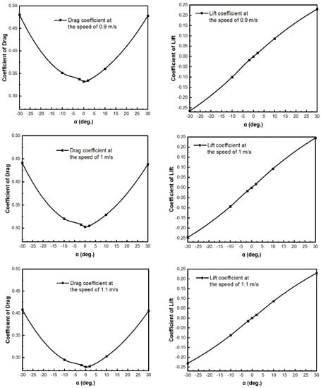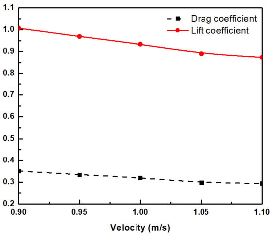 Drag and lift coefficients curves for the underwater glider with the angle of attack θ = −10° at the different velocities.