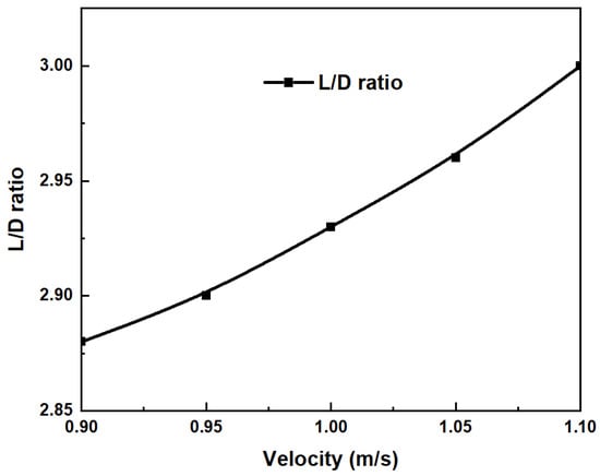 To obtain the hydrodynamic characteristics of the underwater glider in this present work, the different glider velocities (from 0.9 m/s to 1.1 m/s) and angles of attack (−30°, −10°, −2°, 2°, 10°, 30°) are considered in this study. The numerical results of the drag and lift coefficients, flow behavior, force, and pressure distribution, which are computed using CFD analysis, are presented and discussed. Figure 5 demonstrates the pressure distribution at the tip of the nose at different torpedo velocities. From the present results, it can be seen that the tip of the nose is strongly affected by the fluid flow. During this period, the value of pressure at the bow of the glider slightly fluctuates around 10,000 Pa. This phenomenon should be noted to select the appropriate material in further studies. The contribution of the profile of the hull and wings is significant. While the wings of the glider mainly generate the lift force, the glider’s hull is one of the factors that create the hydrodynamic drag force of the glider’s body. Figure 6 shows the drag force acting on the glider body at the different velocities versus time. The drag force increases rapidly at the initial time and then approaches a constant as time goes on. The average lift force with the angle of attack θ = −10° at the different velocities of the glider is presented in Figure 7. The numerical results indicate that the higher the underwater glider velocity, the larger the drag force and lift force acting on the glider. Figure 8 gives information about drag and lift coefficients at five different values of glider speed. These coefficients are calculated by using hydrodynamic parameters obtained from the numerical simulations. As can be seen from the numerical results, the drag and lift coefficients decrease gradually when the glider velocity reduces. Table 3 indicates the average values of drag force, lift force, drag coefficient, and lift coefficient of the underwater glider at the different velocities when its angle of attack θ = −10°. The lift to drag ratio (L/D) at the different speeds of the underwater glider is presented in Figure 9. The numerical results indicated that the higher the velocity of the glider, the larger the drag and lift forces due to higher pressure acting on the glider body. It can be seen that the lift to drag ratio increased gradually when the glider velocity increases.