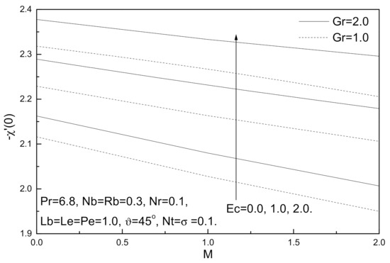 Figure 2, Figure 3, Figure 4 and Figure 5 display the effects of Grashof number Gr, magnetic field parameter M and Eckert number Ec on the local skin friction coefficient, local Nusselt number, local Sherwood number, and local density of the motile micro-organisms. It is clear from these figures that an augmentation in Grashof number Gr tends to minimize the local skin friction coefficient while maximizing the local Nusselt number, local Sherwood number, and local density of the motile micro-organisms. On the other hand, an increase in the value of Eckert number Ec reduces the local skin friction coefficient and local Nusselt number while both the local Sherwood number and local density of the motile micro-organisms decrease with this increase. By contrast, an increment in the magnetic field parameter M increases the local skin friction coefficient and decreases the local Nusselt number, local Sherwood number, and local density of the motile micro-organisms number due to the presence of Lorentz force which acts against the flow and resists the motion.