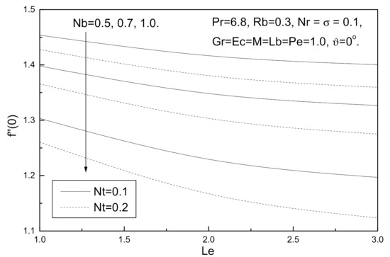 Brownian motion number Nb, thermophoresis parameter Nt and Lewis number Le effects on local skin friction coefficient.