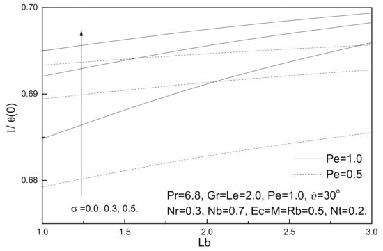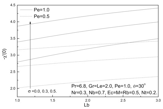 Figure 10, Figure 11, Figure 12 and Figure 13 demonstrate the influence of local skin friction coefficient, local Nusselt number, local Sherwood number, and local density of the motile micro-organisms number for various values of bioconvection Lewis number Lb, bioconvection Peclet number Pe, and bioconvection constant σ; it is noted that for these parameters, bioconvection Lewis number Lb, bioconvection Peclet number Pe, and bioconvection constant σ have the same effects. With increasing bioconvection Lewis number Lb, bioconvection Peclet number Pe or bioconvection constant σ, local Nusselt number, local Sherwood number, and local density of the motile micro-organisms number increase, whereas the local skin friction coefficient decreases with these increases.