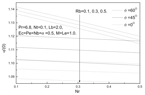 Figure 14, Figure 15, Figure 16 and Figure 17 illustrate the influence of buoyancy ratio parameter Nr, bioconvection Rayleigh number Rb, and the angle of inclination ϑ on the local skin friction coefficient, local Nusselt number, local Sherwood number, and local density of the motile micro-organisms number. The values of the angle of inclination ϑ (ranging from 0° to 60°), see Ref. [29], include ϑ =0°, which represents the vertical plate, and ϑ =90°, which represents the horizontal plate. It is clear from these figures that an augmentation in the angle of inclination ϑ has the same effect as Grashof number Gr, which tends to minimize the local skin friction coefficient while maximizing the local Nusselt number, local Sherwood number, and local density of the motile micro-organisms. It can be observed from these figures that an increase in the buoyancy ratio parameter Nr and bioconvection Rayleigh number Rb tends to decrease local Nusselt number, local Sherwood number, and local density of the motile micro-organisms number, whereas the local skin friction coefficient decreases.