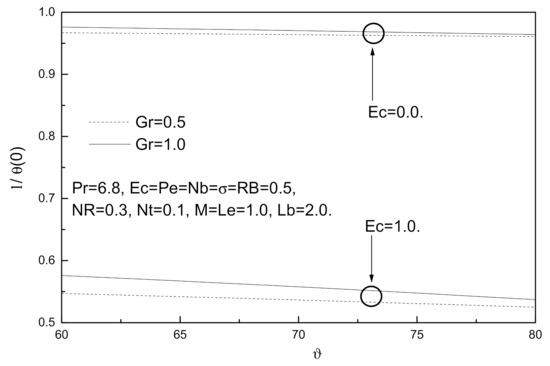 The effect of viscous dissipation on the dimensionless local skin friction, Nusselt number, Sherwood number, and density number of the motile micro-organisms are shown in Figure 18, Figure 19, Figure 20 and Figure 21. It has been observed from these figures that the presence of viscous dissipation leads to a decrease in the rate of heat transfer and local Nusselt numbers as well as local skin friction because viscous dissipation (Eckert number Ec) works to raise the temperature of this fluid. On the other hand, the presence of viscous dissipation works to increase both the Sherwood number and density number of the motile micro-organisms.