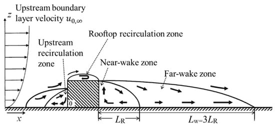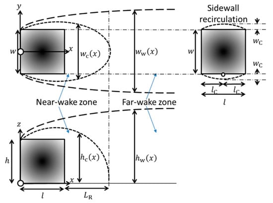 The near-wake zone described in Equations (5) and (6) is confined vertically to the height of the obstacle and laterally to its width. The length of the near-wake zone in the streamwise direction is expressed as follows []: