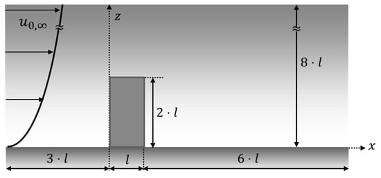 where and are the width and height of the obstacle, respectively, and the length of the obstacle in the flow direction is specified as . Equation (5) makes the calculation of stable values for possible by avoiding a large despite a small through the introduction of a scaling factor [].