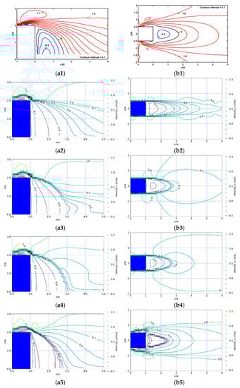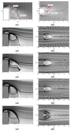 Figure 5(a1,b1) show the streamlines obtained from the experiment by Wang et al. [] representing the flow fields on the symmetry plane at and on the mid-height horizontal plane around the obstacle at , respectively. The general wake pattern behind an obstacle is characterized by recirculating flow. The near-wake zone behind the obstacle is one of the regions where recirculating flow occurs. As shown in Figure 5(a1), a distinct recirculating flow occurs in the near-wake zone behind the object. In Figure 5(b1–b5), it can be seen that two recirculating flows occur in the near-wake zone. Note the slight extension of the recirculation flows on the horizontal plane slightly beyond the width of the obstacle and the presence of other circulations that flow near both sides of the obstacle.