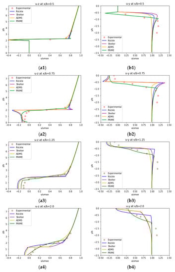 (a1–a5) Vertical and (b1–b5) horizontal profiles of velocity component : (a1,b1), ; (a2,b2), ; (a3,b3), ; (a4,b4), ; (a5,b5), . is the velocity in the undisturbed flow, which was 6.75 m/s at for vertical profiles and 4.02 m/s at for horizontal profiles.