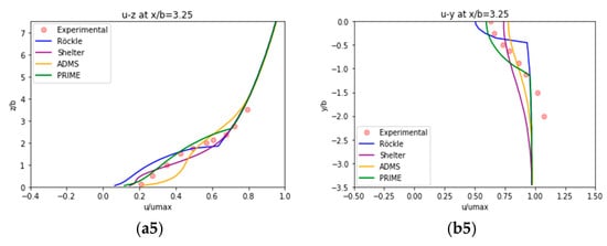 As shown in the profiles in Figure 7(a4,a5,b4,b5) for and , which were located in the far-wake zone away from the near-wake zone, the difference between the experimental results and the results from all the models except the PRIME model increased as the distance from the back of the obstacle increased. In the PRIME model, the experimental results were reproduced very well in the regions corresponding to these far-wake zones.