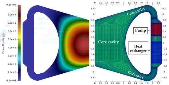 We demonstrate the applicability of the developed ROM to parametric steady-state and transient problems in the Molten Salt Fast Reactor (MSFR) []. For this, a 2D axisymmetric model is employed. The MSFR is a liquid-fuel nuclear reactor in which the fissile material is dissolved in a molten salt that is circulated in a loop. Heat (3 ) is generated by the nuclear fission reactions and is predominantly deposited in the liquid fuel. Figure 2 shows the geometry and mesh used for the simulations together with the distribution of the power deposition. The mesh was adopted from [] and contains 16,140 cells.