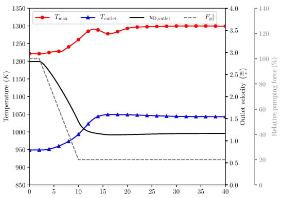 The first numerical example considers a steady-state scenario of the MSFR with several uncertain parameters. As the second case, a transient scenario is analyzed. The transient starts from a steady-state, which is obtained using the default parameters from Table 1 and Table 2. At t = 2 s, a flow coastdown is simulated by linearly ramping down the pumping force from 100 to 20 in . Figure 3 showcases this transience with = 8 s.