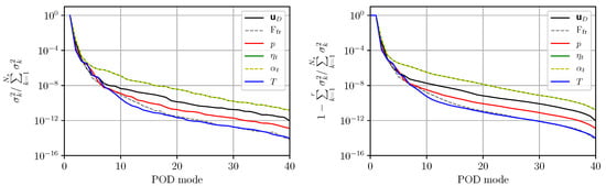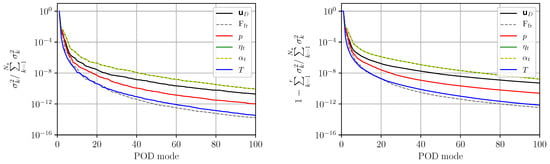 Note, the values were normalized by the square sum of the singular values. Furthermore, since the energy truncation limit () was employed in this example for the determination of the number of POD modes used for the generation of the ROMs (see Equation (18)), the truncated energy per POD mode is showcased in Figure 4 as well. Overall, we see a rapid decay in the squared singular values, indicating that the solution exhibits a low-dimensional behavior.