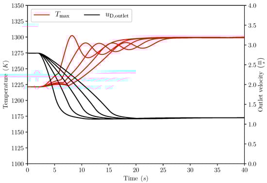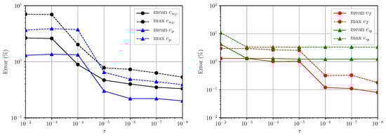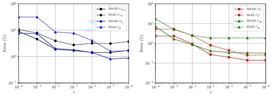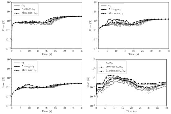 The time-dependent error curves of the field variables over the test parameter set are presented in Figure 11 for . It is visible that, for the velocity, pressure and temperature, the highest relative errors appeared in the new steady-state in many cases. The possible reasons behind these effects are further discussed in Section 4.