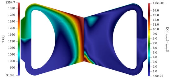 Figure 7 presents the temperature solution of the FOM (left) together with the absolute error between the FOM and the ROM (right).