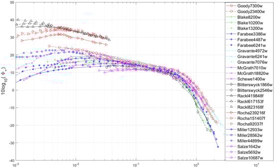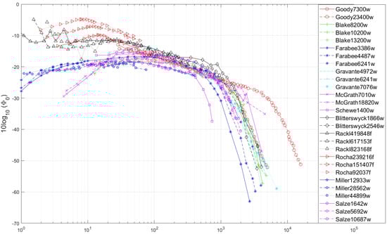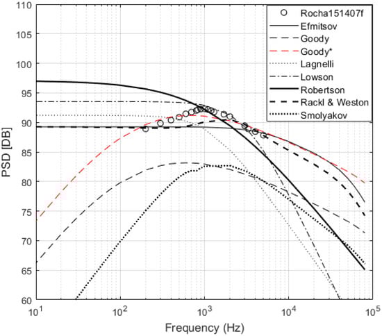 n is the PSD sampled at a specific frequency, and N is the total number of samples taken. In previous studies found in the literature, the evaluation of models and experiments are made either by visual inspection or by comparing the slope of the PSD for the low, medium, overlap and high-frequency ranges. Comparing the models based solely on the slope of PSD at different frequencies fails to account for a difference in magnitude. Ideally, both the shape and magnitude of the PSD should be compared when evaluating a model so that accurate estimations of the sound produced can be determined. The PSD for Goody23400w and Rackl419848f can be seen in