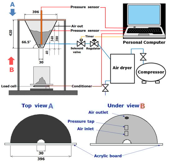 Figure 4 shows a schematic diagram of the experiment equipment and measuring equipment. This hopper has a dual-structure, with a rubber flexible container with a 0.5 mm thickness inserted into a stainless steel semi-conical rigid container of a 1 mm thickness, and a transparent acrylic panel of a 5 mm thickness is mounted on the vertical side to allow for viewing of the flow structure of the powder. In addition, by fastening the top end and bottom end of the hopper, an airtight cavity was provided to enable the supply of compressed air between the rigid container and flexible container. Detailed dimensions of the hopper are a height of 420 mm, diameter of 396 mm, discharge port diameter of 30 mm, and incline angle of 66.5°. To maintain a constant expansion rate of the flexible container due to the supply of compressed air, supplied air injection ports (pipe inner diameter 6 mm) are provided, as indicated in Figure 5, at seven points, located at heights from the hopper bottom of 40 mm (No. 1), 90 mm (No. 2), 140 mm (No. 3), 190 mm (No. 4), 240 mm (No. 5), 290 mm (No. 6), and 340 mm (No. 7), and the injected air was discharged from the discharge port (pipe diameter of 8 mm) located at a height of 380 mm from the bottom of the hopper. Compressed air produced by the compressor passed through an air dryer, regulated to the proper pressure with a pressure reducing valve, and supplied via a solenoid valve to the airtight cavity between the rigid container and flexible container of the hopper. By repeatedly opening and closing this solenoid valve, the flexible container can be made to oscillate.