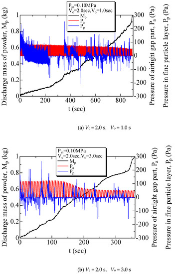 We examined the time variation in the powder discharge rate Mp, airtight cavity pressure Pa, and cavity fluid pressure Pp in the state with powder when Vc was 2.0 s, and Vo was 1.0 s or 3.0 s. These results are shown in Figure 12 and Figure 13. In addition, in these graphs, the horizontal axis is time, and the vertical axes are the powder discharge rate (black line), airtight cavity pressure (red line), and cavity fluid pressure (blue line).