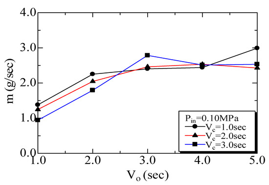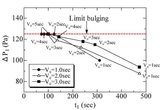 In Figure 15, the overall trend was toward smaller t1 and larger ΔP1 for each Vc with increasing Vo. However, the maximum value of ΔP1 approached the expansion limit of the flexible container at approximately 125 Pa, and therefore it was confirmed that the value of ΔP1 did not increase higher than this.