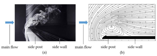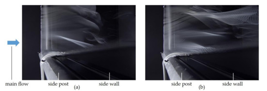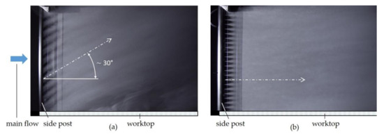 Streaklines in the area of side post and side wall: (a) fume hood with improved jet nozzles, steady outflow, = 14.1 m3/h, = 3.6 × 10−4 kg∙m/s2 and (b) fume hood with oscillators, = 6.8 m3/h, = 1.78.