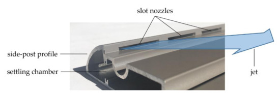 Basically, the shape and development of the jet is influenced by the geometry of the jet exit opening. For stability and manufacturing reasons, the side post profile cannot be provided with a continuous slot in the fume hood investigated here; this must be replaced by rectangular nozzle openings with a height of 2 mm and a width of 30 mm. Fixed ridges with a width of 10 mm remain between the individual outlet openings. The side post profile is designed as a settling chamber, so that air jets emerge through slit-shaped nozzle openings into the inner space of the fume hood, see Figure 5.