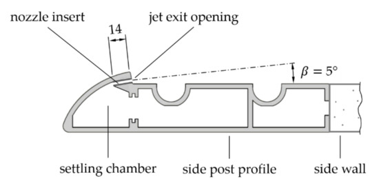 In addition to the length of the nozzle, its orientation also influences the jet development. In the baseline fume hood, the jet exit angle to the side wall is = 25° (Figure 6). Insights into the effects of the jet exit angle on the development of the approach behavior of a plane wall jet can be derived from the investigations of Nasr and Lai [20]. Their results show that for an exit angle to the wall of , the assumed jet axis approaches the wall soon after exit, while convergence of the jet axis with the wall at an exit angle of no longer occurs in the measured field.