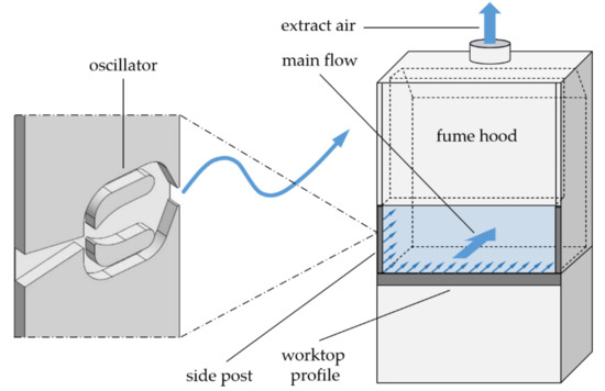 In the second, more far-reaching step, the effect of oscillating jets is investigated. The idea of using oscillating air jets in the fume hood is based on the finding in several studies (e.g., [18]) that with oscillating jets a comparable effect on the prevention of detachment and recirculation can be already achieved at a smaller momentum coefficient than with steady jets. With the same main flow, it allows for a further reduction in the jet volume flow rate and thus a further reduction in the energy required for jet generation, as well as a smaller effect on the inflow velocity in the front opening, which influences the retention capability of the fume hood, at a constant exhaust air volume flow rate. The design of the oscillators integrated into the frame profiles of the fume hood is carried out with the support of a computational fluid dynamics (CFD) simulation and validated with experiments.