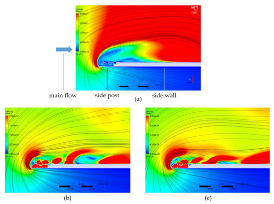 Flow in the area of side post and side wall. Diagrams with sectional streamlines of the mean flow field in a horizontal level and contours of the three-dimensional velocity magnitude normalized by the mean inflow velocity: (a) without wall jets; (b) steady wall jets ( = 14.1 m3/h); and (c) oscillating wall jets ( = 6.8 m3/h).