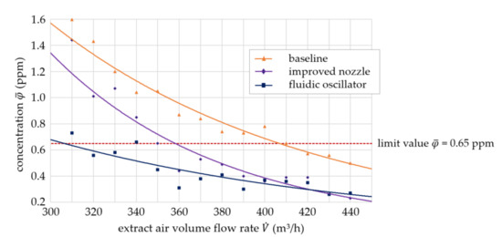 For the specified limit values, a distinction is made between the maximum permissible mean value of = 0.65 ppm and the maximum permissible peak value of = 3.25 ppm ( = 5 · . It shows for all measured configurations that the minimum extract air flow rate is not determined by the maximum permissible value , but by the maximum permissible average value , see Figure 27.