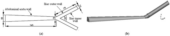 Geometry and dimensions (mm) of the aorta bifurcation into the iliac arteries, in the median z plane (a) and the three-dimensional model geometry view (b).