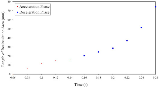 To evaluate the development of the recirculation area, the variation of recirculation spread close to the outer wall of the iliac artery during the acceleration and deceleration phases is presented in Figure 10.