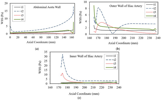The atherosclerotic plaque formation, together with its focal distribution has been associated with the variations of WSS. In fact, it has been established that arterial locations where the WSS is significantly lower in magnitude and oscillatory values occur, appear to be the highest risk areas for the increase of intimal wall thickening. The WSS distribution along the abdominal aorta and the outer and inner walls of the iliac artery is shown in Figure 11, for all representative instants of the cardiac cycle.