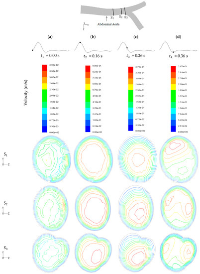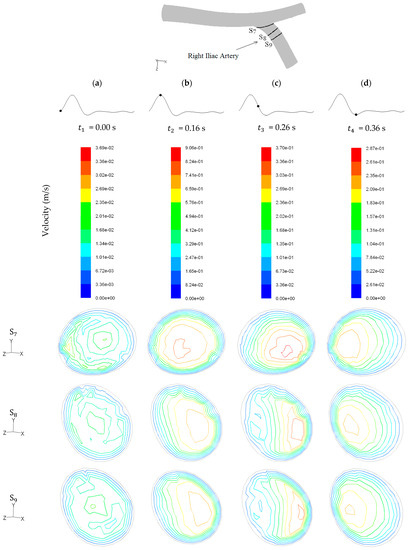 The isokinetic lines for cross-sections of the abdominal aorta, right and left iliac arteries, S1–S9, for time instants of , , , and are presented in Figure 13, Figure 14 and Figure 15, respectively. The cross-sections are outlined in their respective figures. Note that the colored scales for the anatomical results were adjusted to allow the assessment of the velocity magnitude differences for each location at different instants of the cardiac cycle. Without this adjustment, the variations in the velocity would not be noticeable, especially for the instants corresponding to the deceleration phase.
