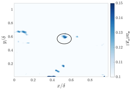 To connect the results of this paper to the amplitude modulation results of Mathis et al. [26] and the conditional averaging results of Chung and McKeon [29], the relationship between coherent vortices and local small scale velocity features is highlighted. Figure 3 shows the contour plot of magnitude of fluctuating small-scale velocity field. The ellipse in the figure indicates the location of the identified vortex. A strong peak in the small-scale velocity magnitude is observed near the location of the identified vortex, which signifies a direct correlation between small-scale velocity features and the coherent vortices used in this study.