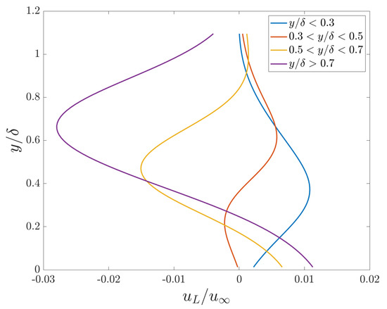 Average fluctuating streamwise large-scale velocity profiles plotted against wall-normal height. Four different ranges of heights of the coherent vortices were used to group the streamwise large-scale velocity data: shown in blue, shown in red, shown in yellow, and shown in purple.