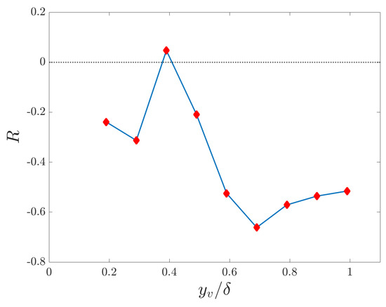 In this definition, is the local fluctuating large-scale streamwise velocity sampled at the same streamwise location as that of the identified vortex, , but at a constant height, . For this study, the constant height is shown at ; very little sensitivity was found when this height was adjusted within the heights of the wake region. The vortex heights were binned in values of , where the height of the vortices varied from to . Mean correlation values were calculated for each bin and plotted as a function of normalised height of the vortex . The results are plotted as shown in Figure 6.
