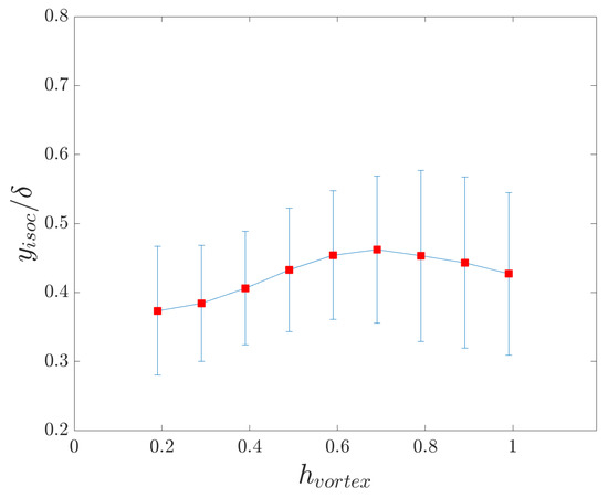 As an alternative comparison between the large-scale streamwise velocity field and the height of coherent vortices in the flow, the height of an isocontour of the complete or non-fluctuating large-scale streamwise velocity field, , was compared to the local height of the vortices. Using the same binning methodology as described before, the average height of the isocontour was plotted alongside the standard deviation for each bin, as shown in Figure 7. The blue lines indicate the standard deviation for each bin while the red squares denote the mean height of large-scale velocity isocontour for each bin. The mean height of the chosen isocontour is found to increase as the height of the vortex increases.