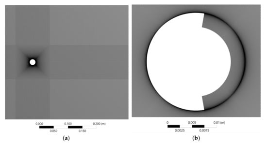 All mesh densities overestimated the RMS lift coefficient and Strouhal number, which is in line with the findings of other 2D simulations [18,37]. With the exception of the finest mesh, it can be said that as mesh density increases, the overshoot of the RMS lift coefficient also increases, while the Strouhal number remains constant. The vortex shedding Strouhal number is accurate only to two decimal places as a result of the frequency domain resolution, which is the reciprocal of the simulated flow time (1 s), i.e., 1 Hz. The main priority of the mesh selection was the time-averaged drag coefficient, as this has been accurately modelled in 2D simulations by Liu et al. [18] and is a key parameter of interest in this project. As mesh density increases, there is a convergence towards experimental values for the time-averaged drag coefficient. However, there is a clear underestimation of the drag, which is similarly evident in the numerical results of Orselli et al. [37]. The mesh with 155,000 elements was deemed a reasonable balance between accuracy and simulation run time. This final mesh can be seen in Figure 3a. The cases with a porous coating had an additional meshing requirement for this region. This can be seen in Figure 3b for a coating angle of 160and a thickness-to-diameter ratio of 14.3%. There is a bias towards the interface between the porous medium and the flow.
