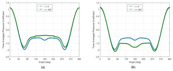 Time-averaged for the smooth cylinder and varying coating angle at = , constant thickness = 14.3% and a porosity of 20 PPI. (a) . (b) .