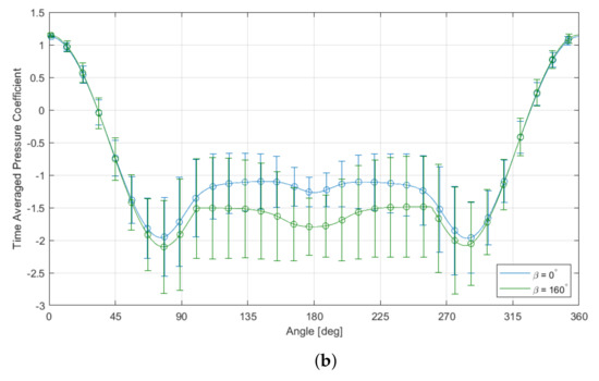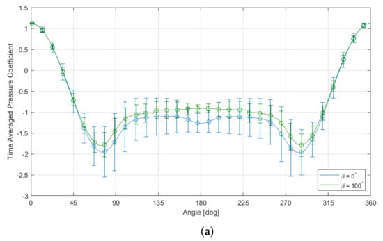Figure 5a shows the pressure distribution of the coating against the smooth cylinder, with bars depicting the standard deviation of the pressure at that point. The standard deviation was calculated over a flow time period of 1 s, equivalent to approximately 25–26 vortex shedding cycles. There is a clear decrease in the pressure fluctuations on both the windward and leeward sides of the cylinder. The opposite is true for , as seen in Figure 5b, where there is an increase in the pressure fluctuations, particularly in and close to the porous region. Although not shown here, the full porous coating saw a significant decrease in pressure fluctuations around the entire cylinder.