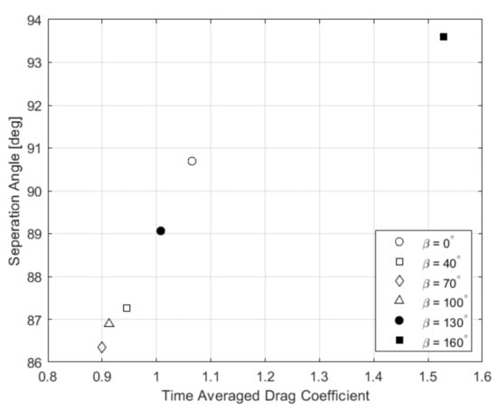 Variation in the separation angle with the time-averaged drag coefficient at = , constant thickness = 14.3% and a porosity of 20 PPI.