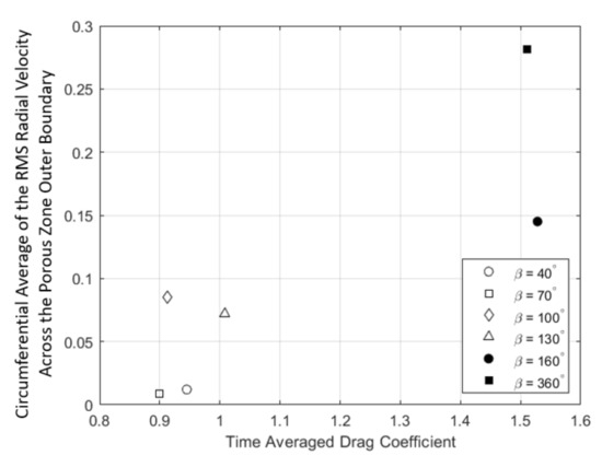 The introduction of a porous coating resulted in a new parameter of interest: the radial velocity across the porous coating boundary. The circumferential average of the RMS radial velocity across the porous zone outer boundary was taken, to illustrate the variation in the level of flow passing in and out of the porous medium. This is shown plotted against the time-averaged drag coefficient in Figure 8. While the relationship is far from linear, there is a clear positive correlation between the drag coefficient and increased flow across the boundary. Interestingly, there is not a linear relationship between the increased porous coating angle and radial velocity, with more flow for the 40 case than the 70 case, and similarly more flow for the 100 case than for 130.