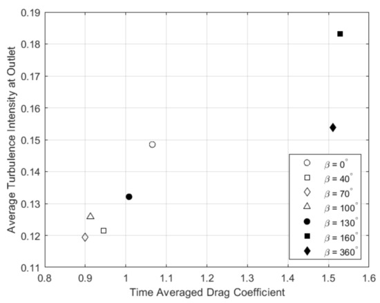 Variation in average turbulence intensity at the outlet with the time-averaged drag coefficient at = , thickness = 14.3% and a porosity of 20 PPI.