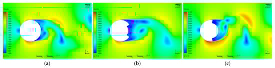 Contours of velocity at . (a) Smooth cylinder. (b) (thickness = 14.3% and a porosity of 20 PPI). (c) (thickness = 14.3% and a porosity of 20 PPI).