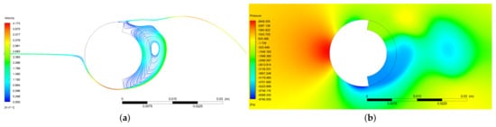 Flow recirculation in the coating at , thickness = 14.3% and a porosity of 20 PPI. (a) Velocity streamlines. (b) Pressure contours.