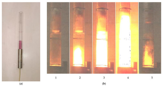 The active unit of the installation contained a guiding element, the object under investigation (in the presented case, a probe) or a rheological medium, and a control cavity formed by a closed elastic shell. The control cavity was located in the starting zone of the guiding element and filled with a working gas. The control cavity was also connected through a pipeline and shut-off-regulating equipment to a working gas source made in the form of an electrolyzer. Locking and regulating equipment contained a spark gap. The operation of the installation was provided by the control equipment. The mixture was formed as a result of the electrolysis of water and fills the control cavity, made in the form of an elastic destructible shell of the required volume (highlighted in red in Figure 1a). The low optical density of the mixture detonation products made it possible to use a guiding element made of an optically transparent material in the active unit of the launcher. The active unit was located in an armored chamber. The process was illuminated through the windows. Optical registration was performed with a high-speed video camera Phantom v1610.