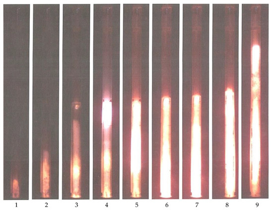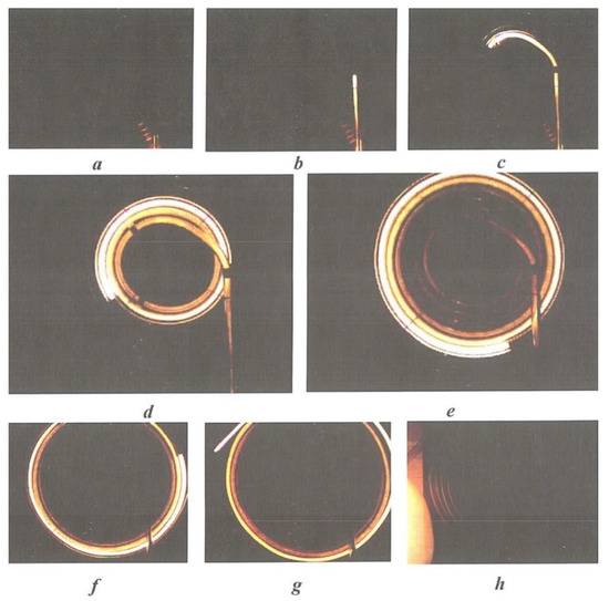 In the series of experiments presented below, the initiation of the active volume of the hydrogen–oxygen mixture was carried out by an electric discharge in a special initiating device. The initiating device, connected to the active charge by a flexible plastic tube, allows using a system of valves to accumulate the gas mixture in the ignition chamber of the high-voltage spark plug, flexible plastic tube, and active volume. At the right time, the mixture was ignited, and the impulse was transmitted to the active volume. The transfer process was investigated in a specially conducted series of experiments with different diameters of the plastic tube: 4, 6, 8, 10, and 12 mm. The tubes were formed into a spiral ring and fixed on a plane. The movement of the detonating pulse through the tubes to the active volume was recorded by a video recorder. Figure 2 shows the results of one of the experiments from the implemented series.
